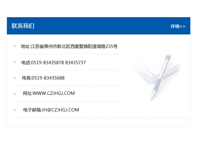 地址:常州市新北區友邦商務大廈1幢16、17層  電話:0519-85101652  傳真:0519-85112595  郵編:213022  網址:www.cz-jiayue_cn.zxshilongwang.com  郵箱:xiajifengaa@163.com